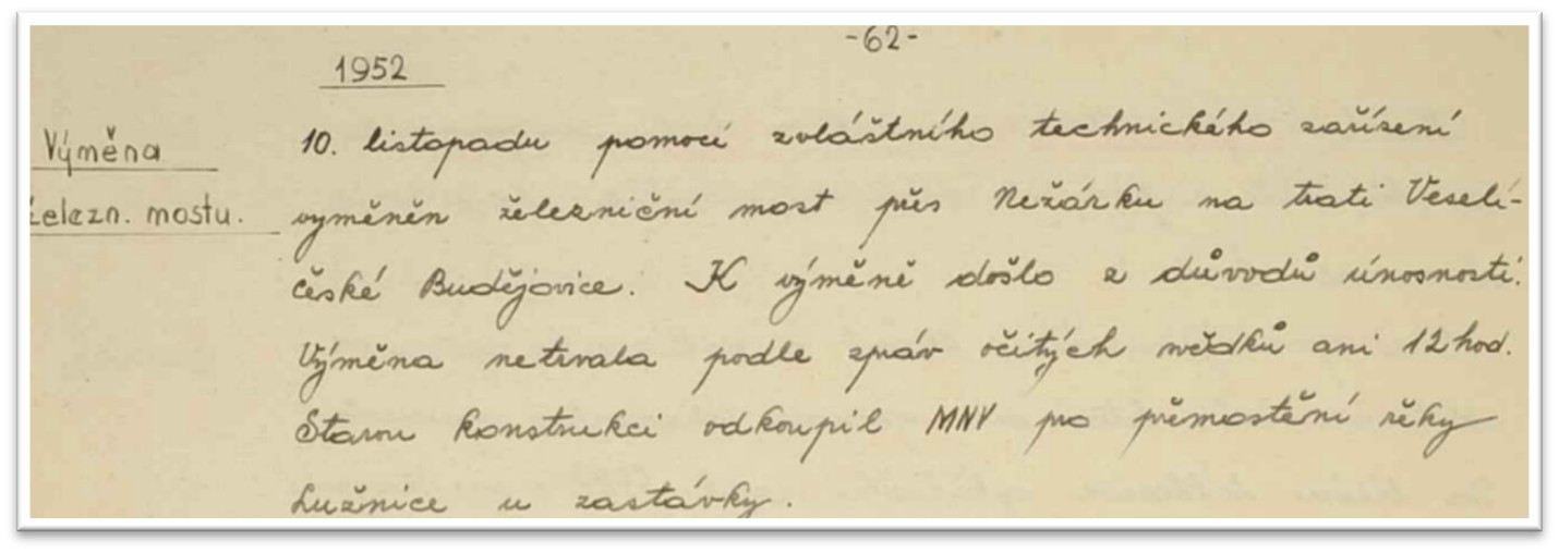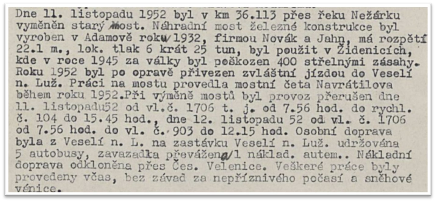 Naštěstí máme ještě jiný zdroj informací, kroniku železniční stanice. Zde se píše: "Dne 11. listopadu byl v km 36.113 přes řeku Nežárku vyměněn starý most. Náhradní most železné konstrukce byl vyroben v Adamově roku 1932, firmou Novák a Jahn, má rozpětí 22.1 m, lok. tlak 6 krát 25 tun, byl použit v Židenicích, kde v roce 1945 za války byl poškozen 400 střelnými zásahy. …". Opět zde máme uvedenu řeku Nežárku, ale již s přesným uvedením kilometrovníku 36.113.